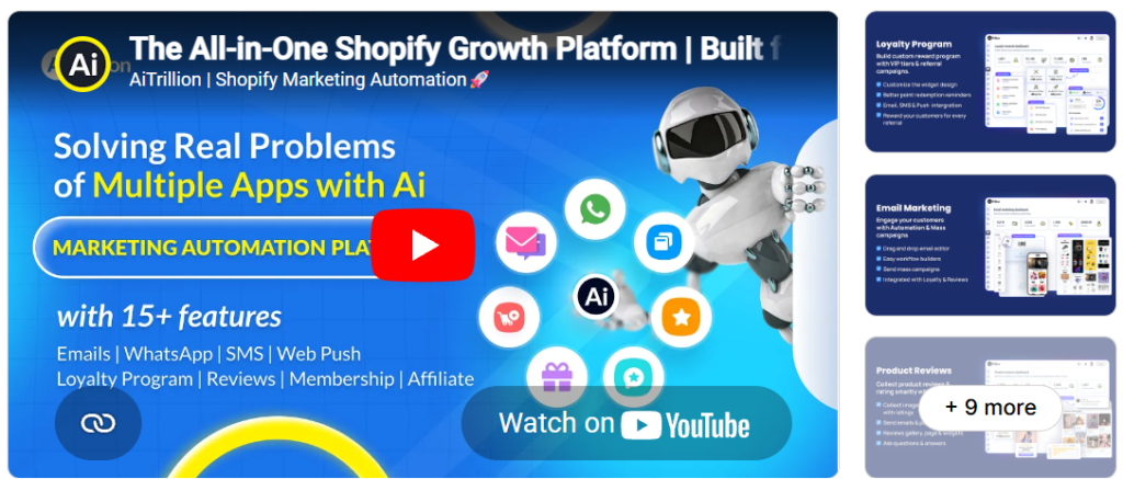 AiTrillion is an all-in-one Shopify marketing platform that replaces multiple apps with one tool. It combines email, SMS, loyalty programs, reviews, pop-ups, push notifications, referrals, and AI recommendations in a single dashboard.