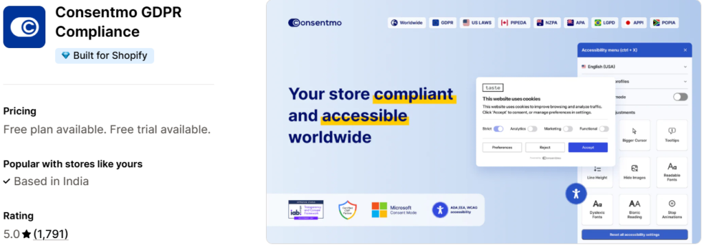 Consentmo handles this automatically. It detects where your visitors are from and displays the correct consent banner for their region – whether that’s GDPR, CCPA, LGPD, PIPEDA, or others. It also generates and maintains DSAR pages, consent records, cookie lists, and more. Packed with an Alt Tag Generator, Smart Geotargeting, Accessibility Widget, and an Integrations Scanner – it’s one of the most well-rounded compliance solutions on Shopify.